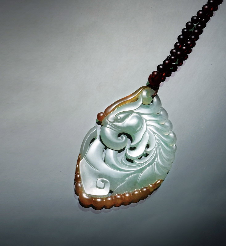 傳承千百年的穿雕工藝,配以俏色的工藝手法,賦有韻律的線條使?jié)h風(fēng)古鳳更具動感,昔日涅烈焰化為顆顆金紅彩珠,將翡翠的繁華之美彰顯于方寸之間。